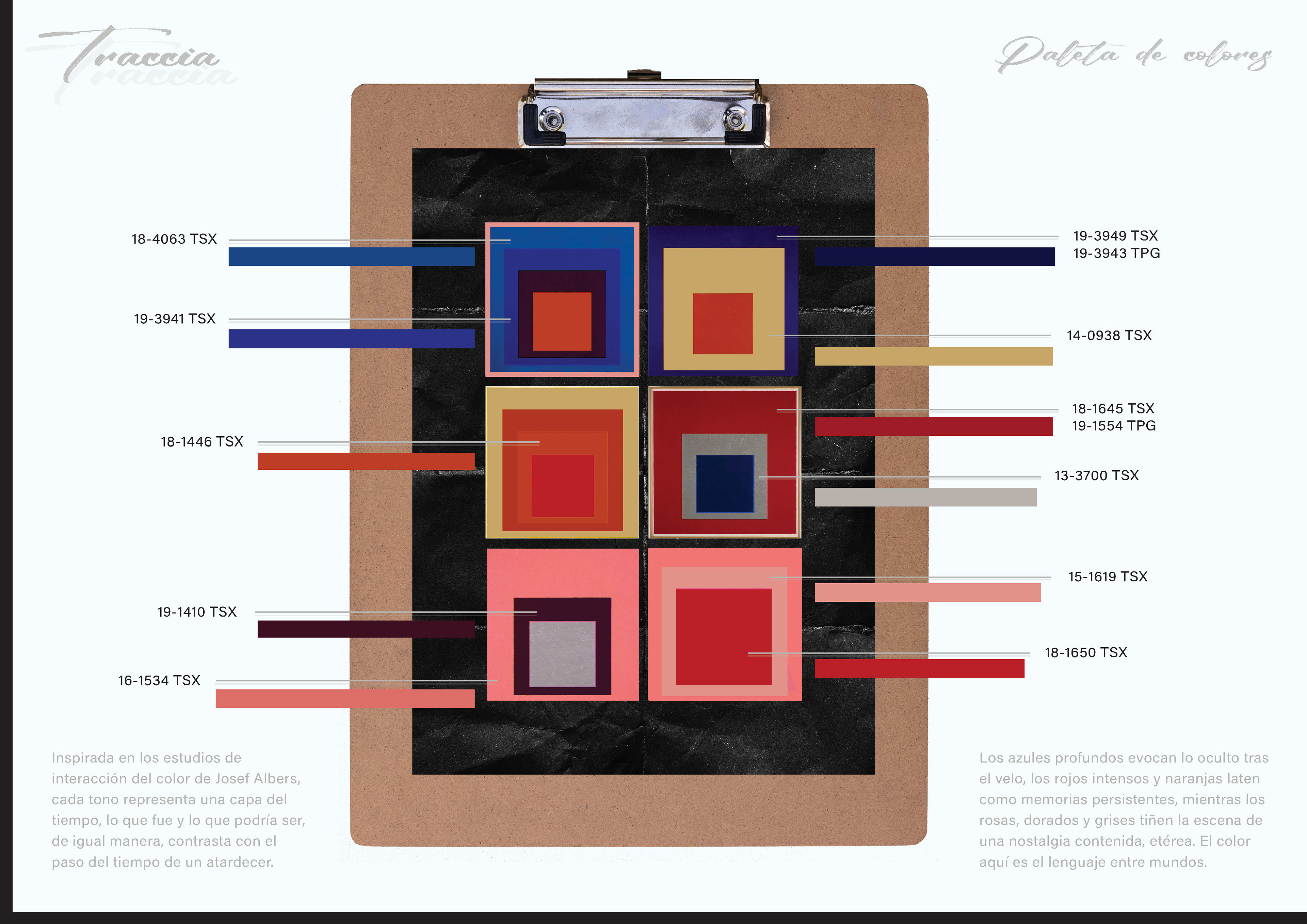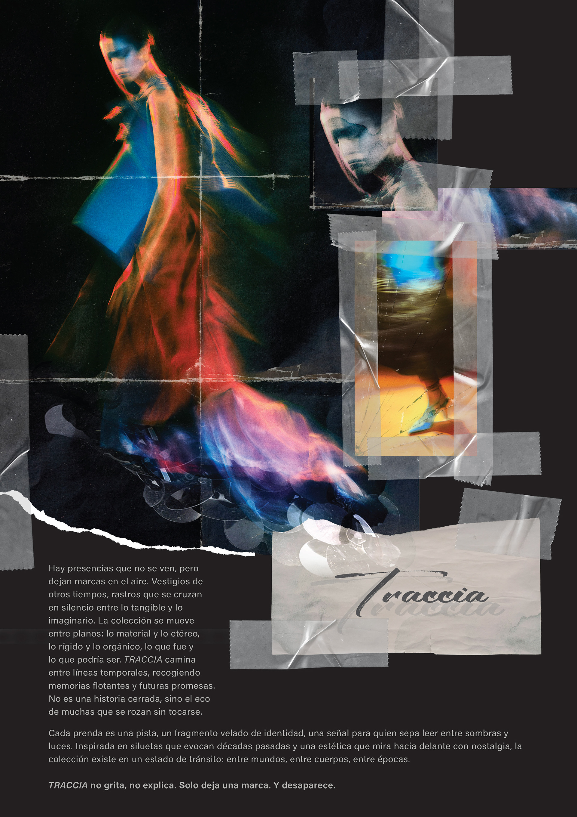 Hay presencias que no se ven, pero dejan marcas en el aire. Vestigios de otros tiempos, rastros que se cruzan en silencio entre lo tangible y lo imaginario. La colección se mueve entre planos: lo material y lo etéreo, lo rígido y lo orgánico, lo que fue y lo que podría ser. TRACCIA camina entre líneas temporales, recogiendo memorias flotantes y futuras promesas. No es una historia cerrada, sino el eco de muchas que se rozan sin tocarse.